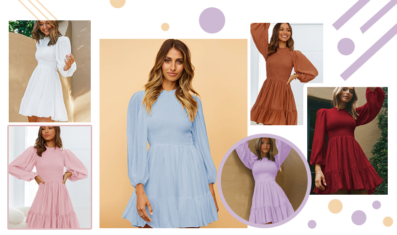 - Model: górna część ciała jest elastyczna i dopasowana, z luźną falbaniastą spódnicą, która jest ciasna u góry i luźna u dołu, dzięki czemu wyglądasz szczuplej i masz dłuższe rękawy.