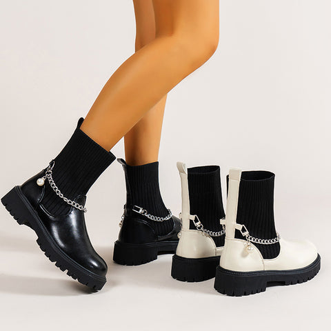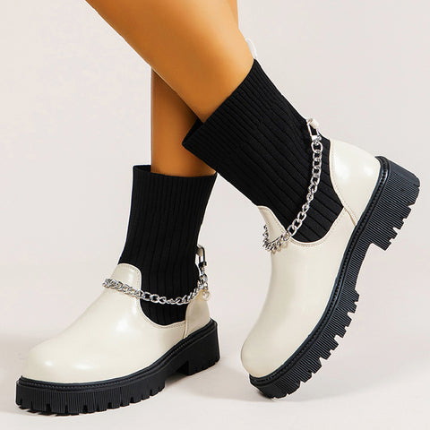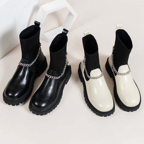 Damskie dzianinowe botki z łańcuszkiem na średnim obcasie jesień i zima nowość