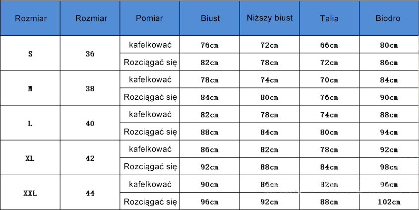 Może wystąpić różnica 2-3% w zależności od pomiaru ręcznego. Proszę dokładnie sprawdzić tabelę wymiarów przed zakupem przedmiotu.